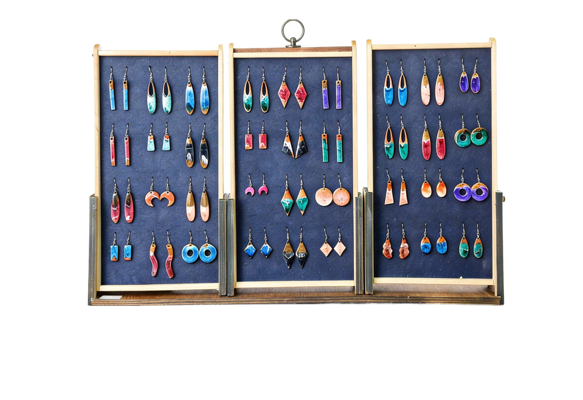 Brincos artesanais combinando madeira e resina, coloridos e originais.