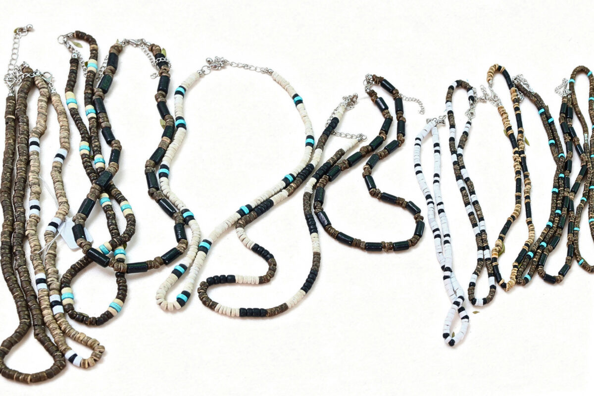 Colares em madeira com pingentes únicos, feitos à mão.