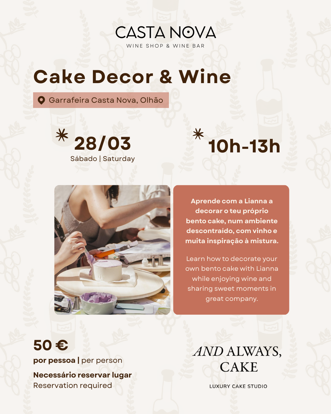 Uma experiência doce e criativa onde a imaginação ganha forma. No Cake Decor & Wine vais decorar o teu próprio bento cake, aprender técnicas com buttercream e criar um bolo único, enquanto desfrutas de vinho e de um ambiente descontraído e inspirador.