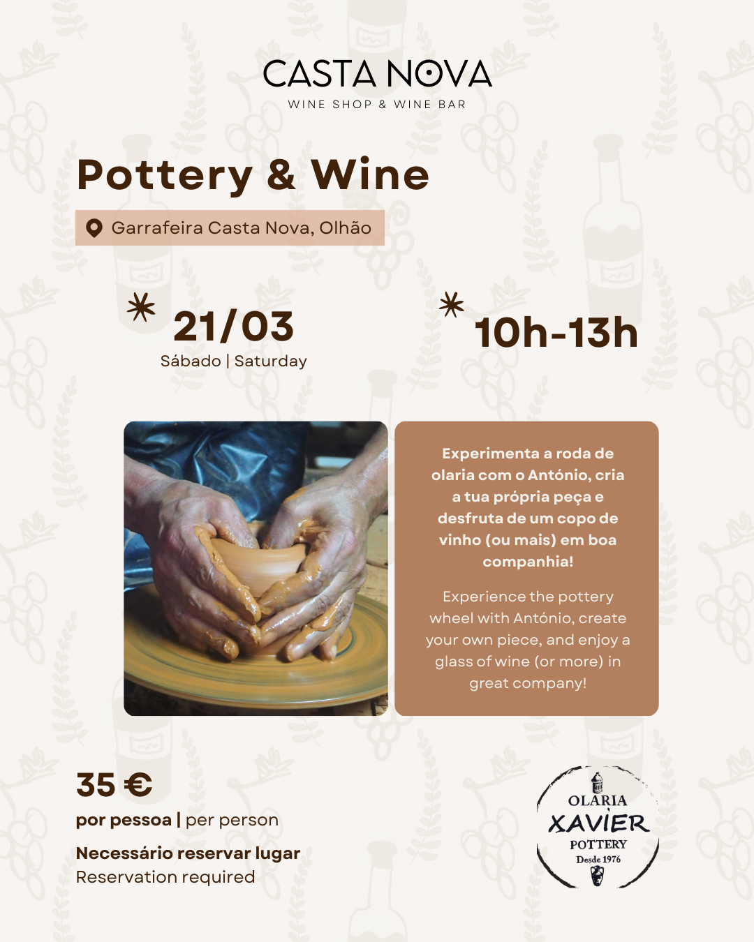 Uma experiência criativa e descontraída onde o barro ganha forma nas tuas mãos. No Pottery & Wine vais experimentar a roda de olaria, criar a tua própria peça enquanto desfrutas de um (ou mais) copos de vinho.