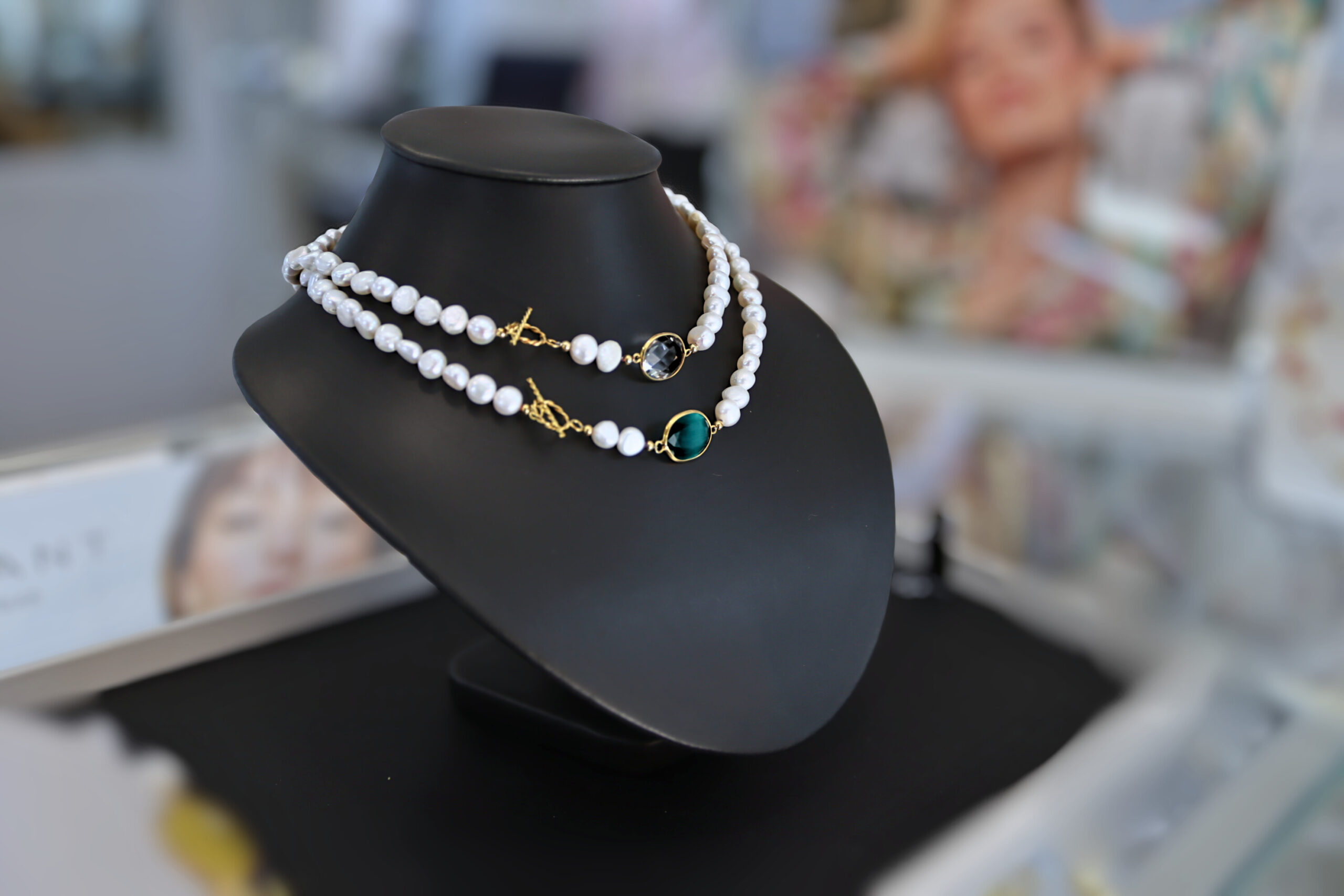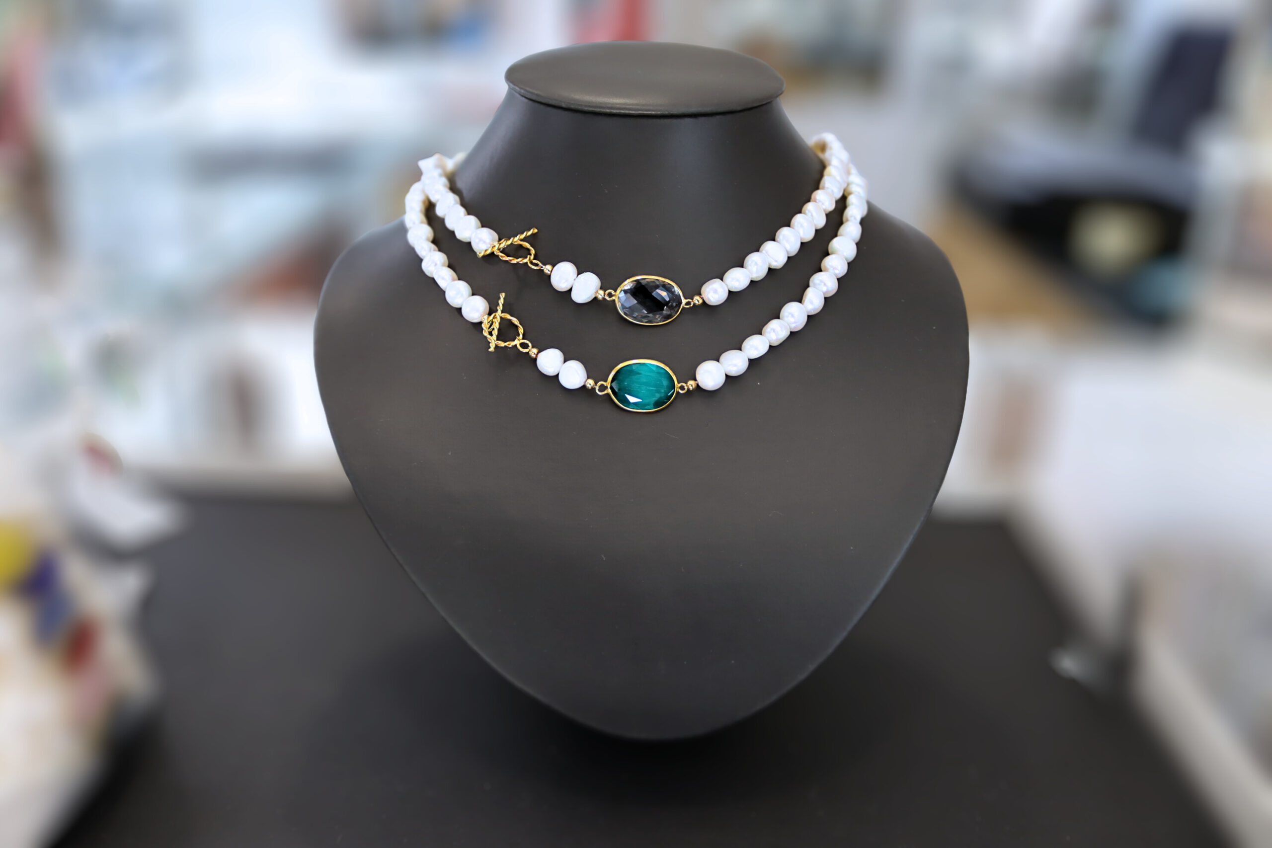 Colar com pérolas naturais estilo barroco, fecho toggle dourado e pedras centrais facetadas em tons esmeralda. Uma peça clássica com um toque contemporâneo, para marcar a diferença com distinção e elegância.